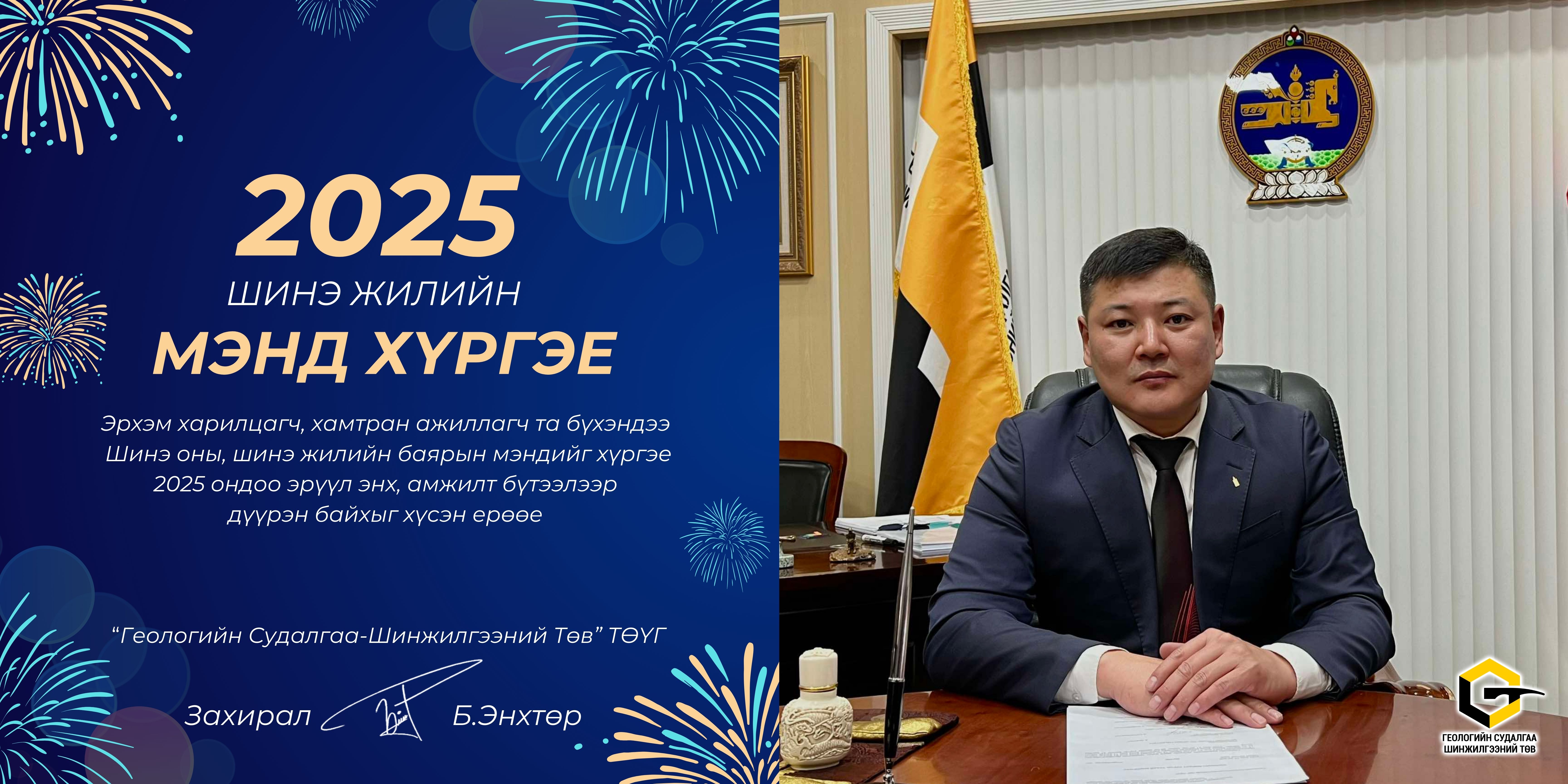 Геологийн Судалгаа-Шинжилгээний төв ТӨҮГ-ийн Захирал Б.Энхтөр нийт харилцагч, хамтран ажиллагч та бүхэндээ шинэ жилийн мэндчилгээ дэвшүүлж байна…